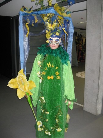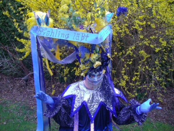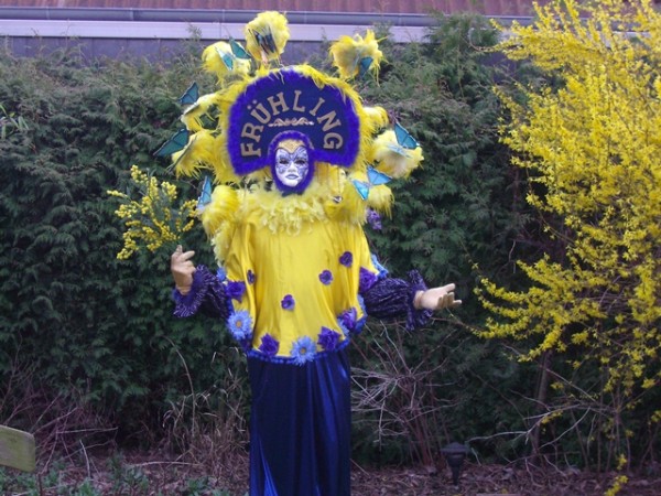 Frühlingskostüm in gelb/blau mit Frühlingsblumen und der Holzschritzug "FRÜHLING".