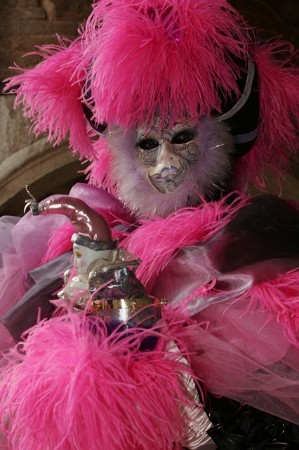 Harlekin in einer Trommel. Prozelanfigur in rosa und pink. Danach ist auch das Kostüm angefertigt worden. Gezeigt beim Karneval in Venedig 2002.