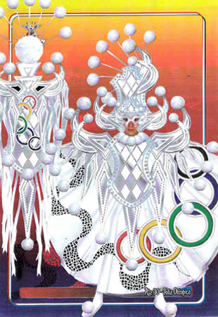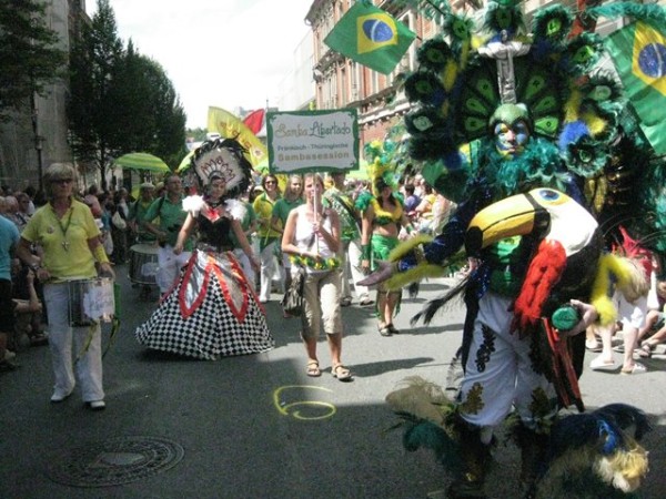 Rechts das Sambkostüm das Herrn Maske präsentierte beim größten Sambafestival (außerhalb Brasilien) in Coburg 2011. Dies Kostüm wird auch beim Kostümball am 21.02.2012 in Rio getragen.
