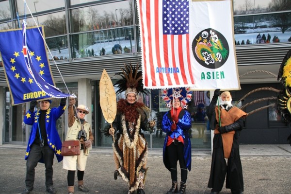 Je Kontinent ist ein Kostüm und eine Fahne mit Namen des Kontinentes vertreten. Die Kostüme sind mit den Fahnen beim Walk-Act ca. 3,50 m hoch und somit auch bei großen Menschenansammlungen sehr gut zu sehen. Einzelheiten finden Sie auf dem Album "Weltkostüme". Hier ist auch das Einzelkostüm "Die Welt steht auf dem Kopf" zu sehen.